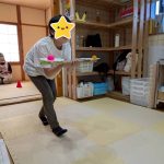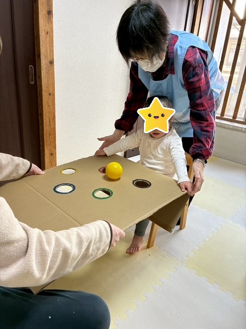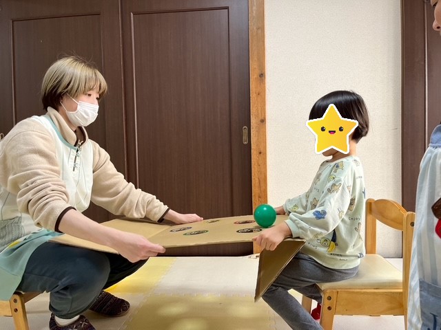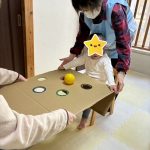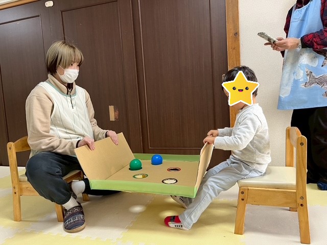 穴の開いた段ボール板にボールを乗せて、職員と一緒に板を持ち、