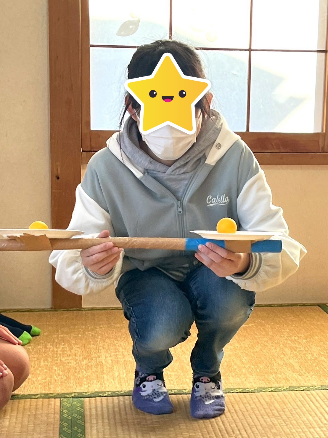 棒の両側に付けた紙皿にボールを乗せ、ボールを落とさないように