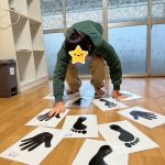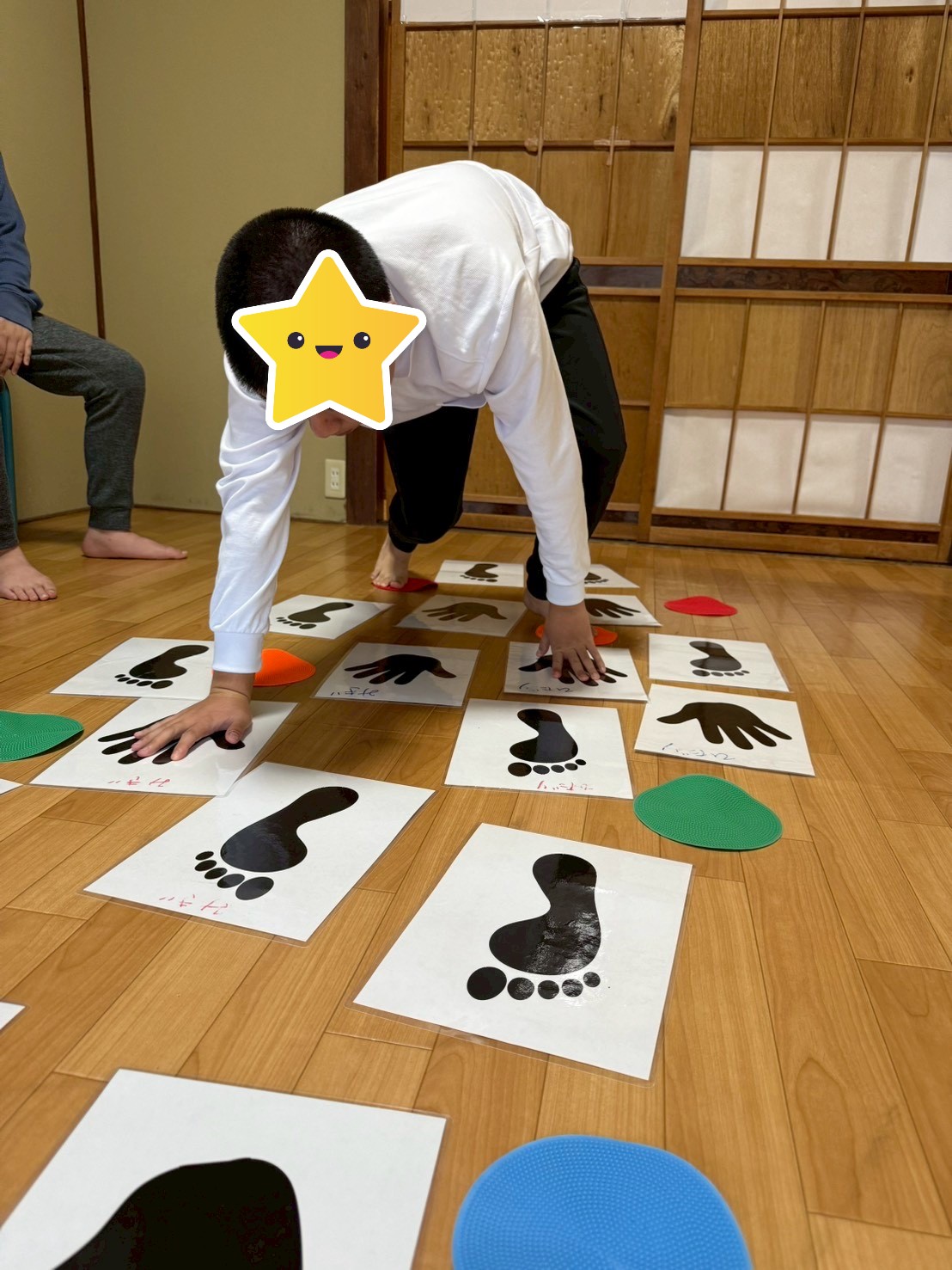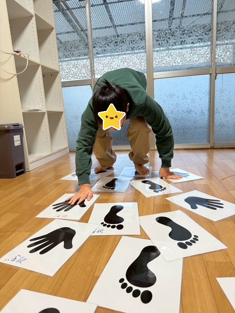 ランダムに置かれた、手形・足形のカードやラバーマットの上を